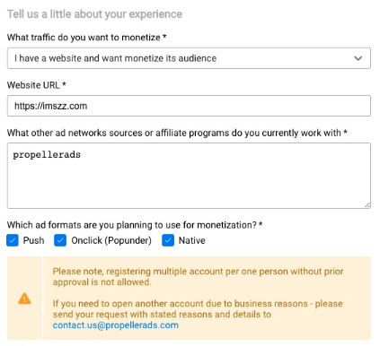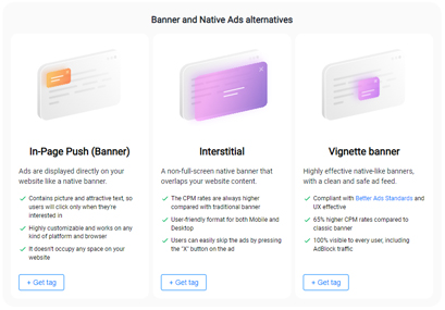 PropellerAds is an ad network specializing in many different ad formats. This includes your traditional display ad options, as well as smart links, pop-ups, interstitials, and browser push notifications. Here we recommend PropellerAds , which is also a traffic platform that is very suitable for beginners.
